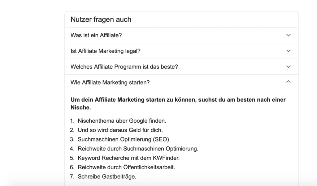 Außerdem empfiehlt es sich spezifische W-Fragen zu Beginn oder zum Ende eines Artikels als FAQ Bereich zu beantworten. Beispielsweise suchen Menschen häufig nach „Was ist + Keyword?“. Baust du die Antwort auf diese Frage direkt zu Beginn oder in einem FAQ Bereich ein, steigerst du die Chance auf Position 0.