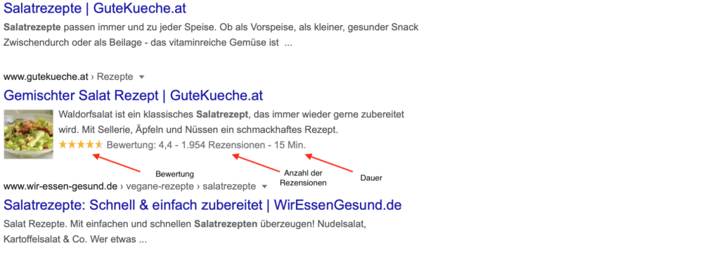 Suchergebnisse bestehen meist aus Meta-Title und Meta-Beschreibung. In gewissen Artikelkategorien können aber sogenannte Schema Markups hinzugefügt werden.