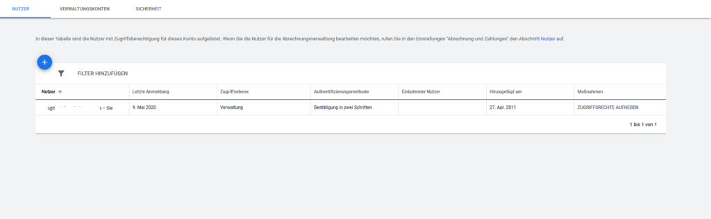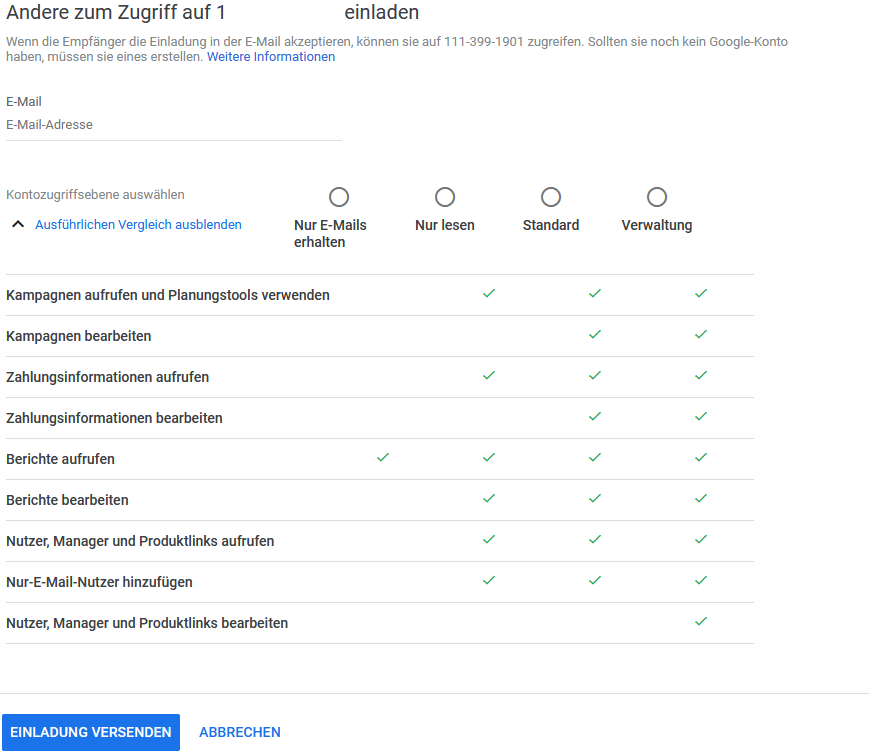 Unter Nutzer kannst du weitere Zugänge für dein Google Ads Konto einrichten. Dabei hast du die Möglichkeit, die Rechte genau vorzugeben.