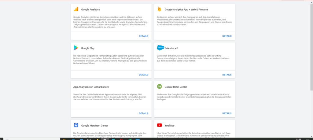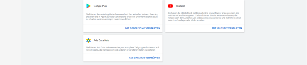 Hier kannst Du Google interne und externe Funktionen mit deinem Google Ads Konto verknüpfen (z. B. YouTube, Analytics, Google Play, Google Merchant Center usw.