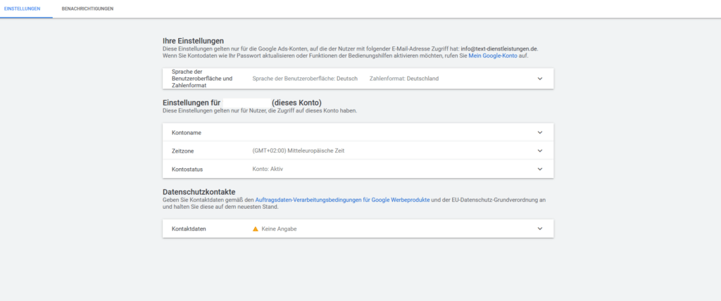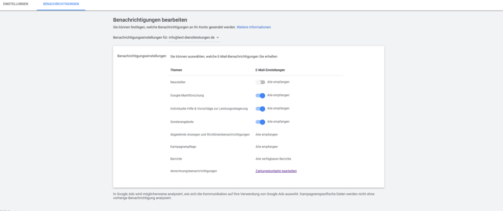 Hier kannst du individuell einstellen, über welche Themen dich Google per Newsletter informieren darf. Unter „Abrechnungsbenachrichtung“ und „Zahlungskontakte bearbeiten“ legst du die Zahlungsmodalitäten für dein Google Ads Konto fest.