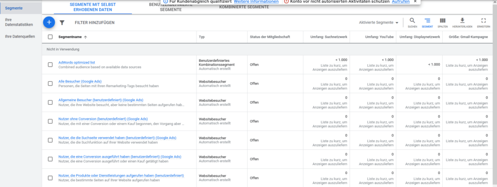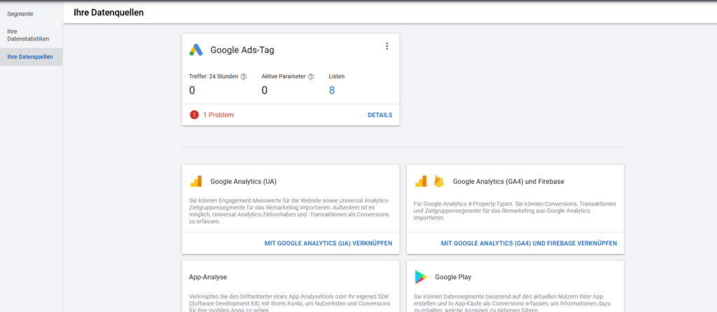 Jetzt kannst du sehen, welche Datenquellen dir für die Generierung deiner Remarketing-Listen zur Verfügung stehen.