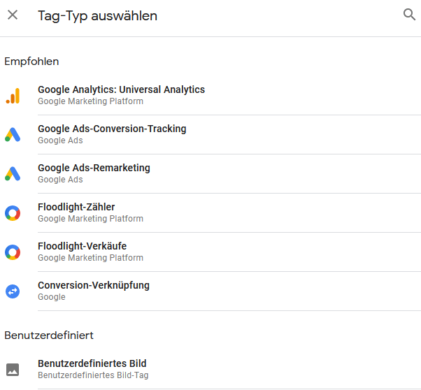 5. Wähle für deinen Remarketing-Tag eine aussagekräftige Bezeichnung und klicke unter Tag-Konfiguration rechts oben auf das Stiftsymbol. Es öffnet sich als Nächstes eine Auswahl verschiedener Tag-Typen.