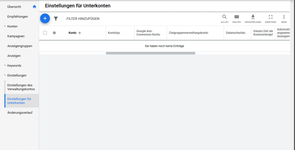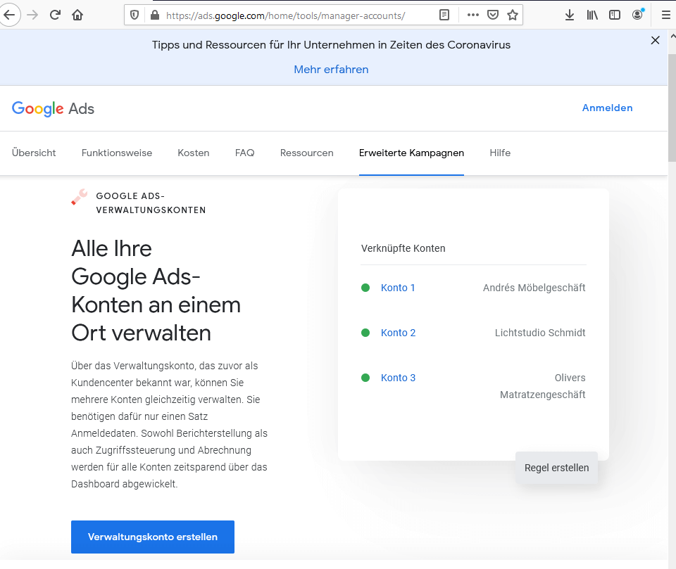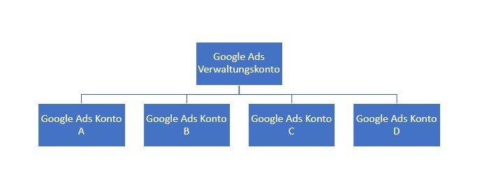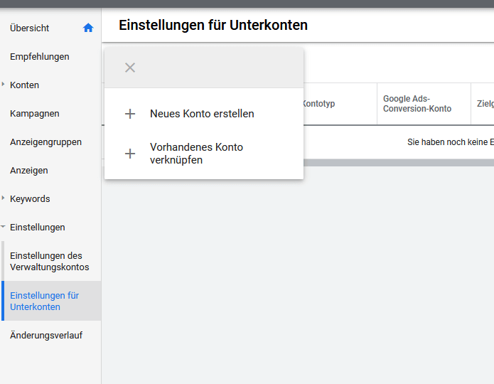 Über das Google Ads Verwaltungskonto lassen sich weitere Google Ads Konten erstellen, ohne dass eine separate E-Mail-Adresse oder Passwort von Nöten sind.