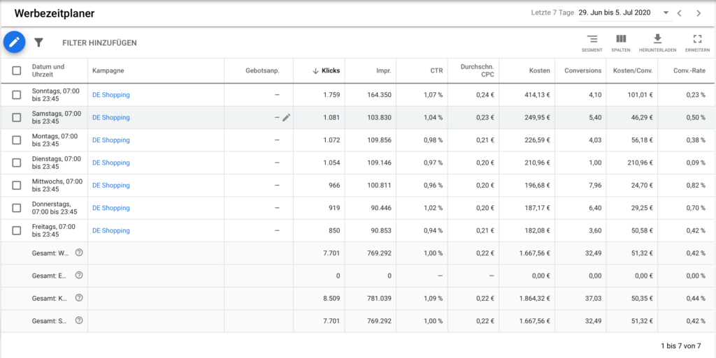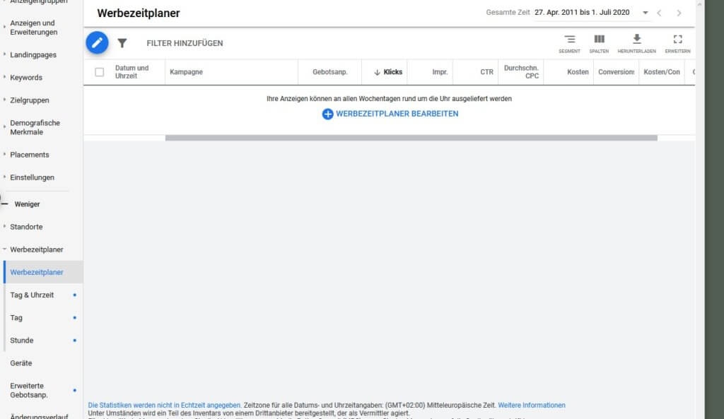 Mit dem Werbezeitplaner gibst Du Google vor, wann deine Google Ads ausgegeben werden dürfen und wann nicht. Daneben hast du die Möglichkeit, direkt über den Werbezeitplaner deine Gebote zu ändern.