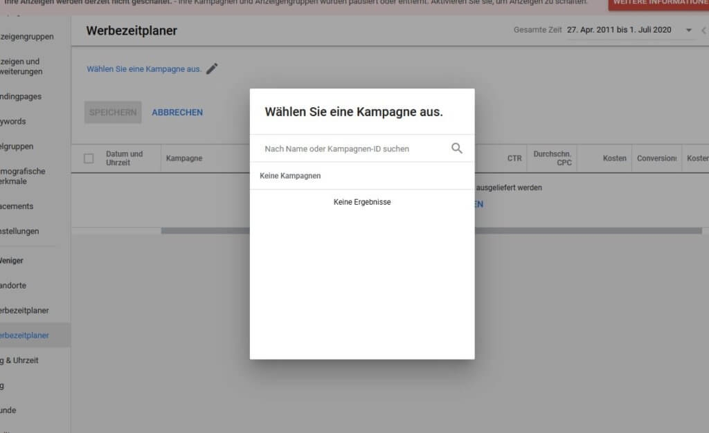 Öffne den Werbezeitplaner im Kontextmenü. Damit deine in der Kampagne gemachten Angaben angezeigt werden, musst Du einfach nur die entsprechende Kampagne anklicken. Nachfolgend bekommst Du ein Diagramm zu sehen, das dir die Zeiten zeigt, wann deine Anzeige geschaltet wurde/wird. Gleichzeitig bekommst Du die Klicks zu sehen, die diese Anzeige bereits generiert hat.