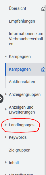 Melde dich in deinem Google Ads Konto an und rufe über das linke Seitenmenü „Landingpages“ auf.